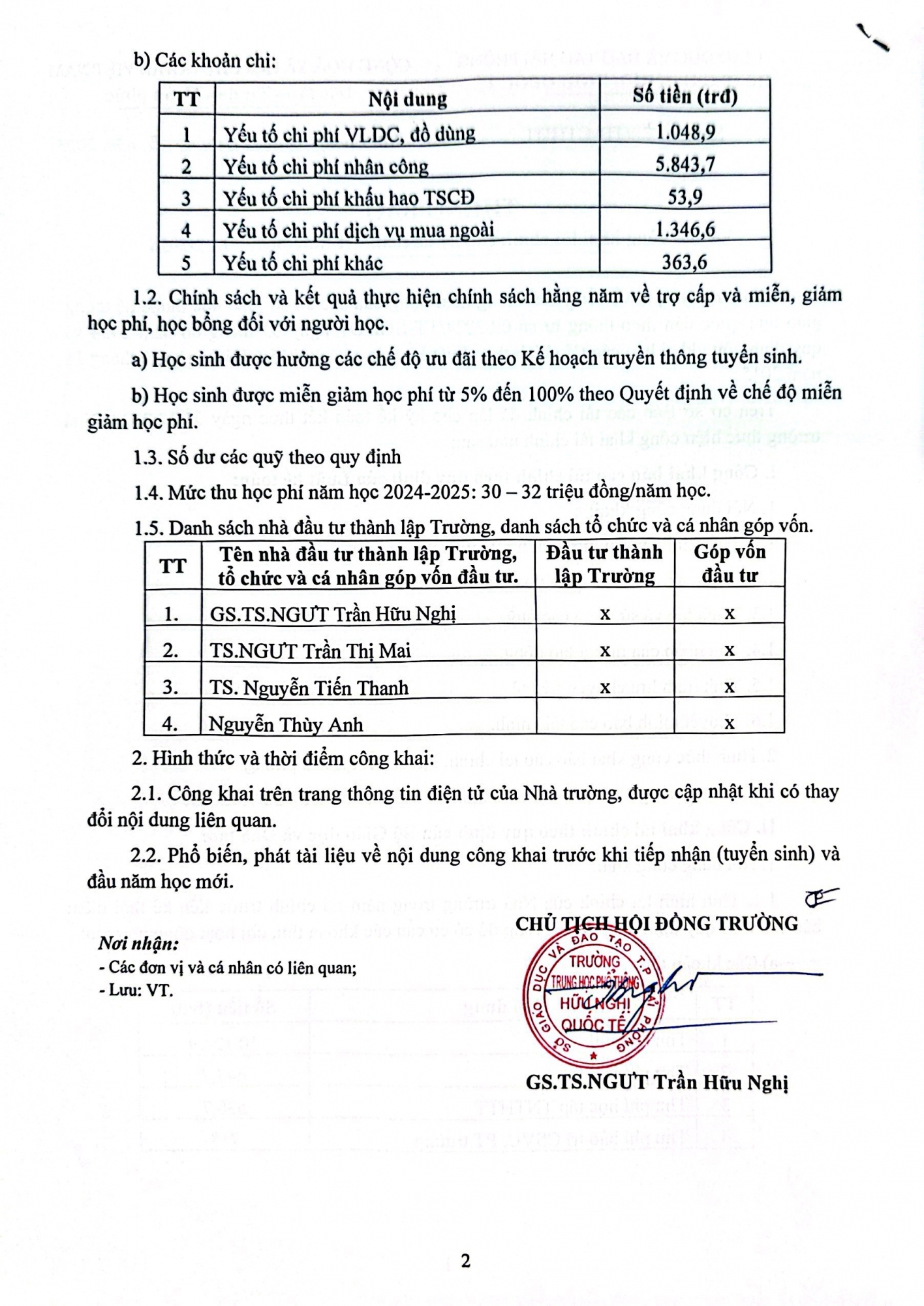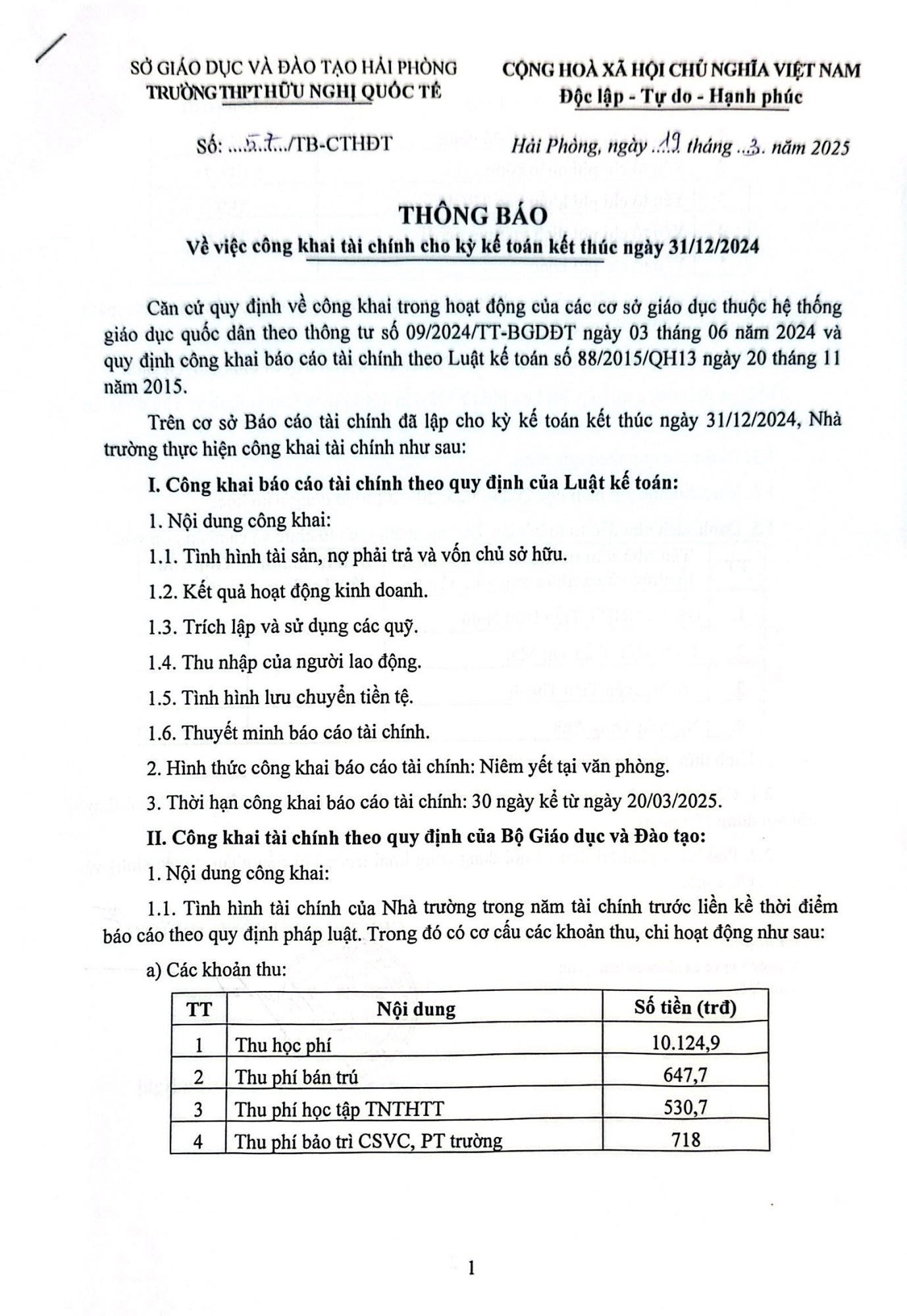 CÔNG KHAI TÀI CHÍNH CHO KỲ KẾ TOÁN KẾT THÚC NGÀY 31/12/2024