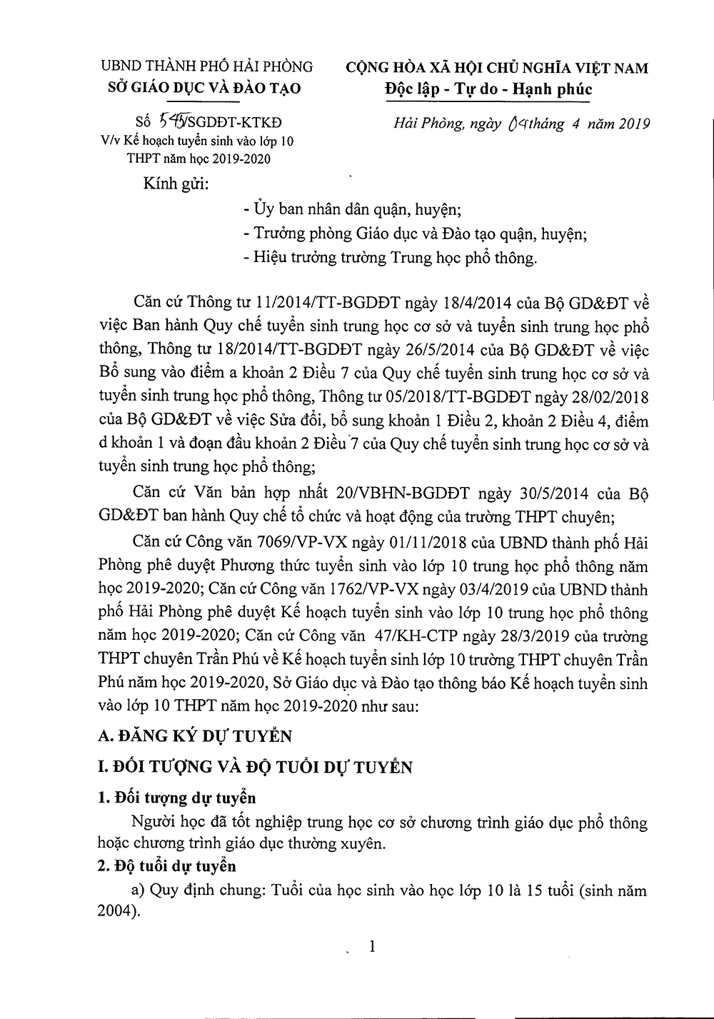 Công văn của Sở GDĐT Hải Phòng về "Kế hoạch tuyển sinh vào lớp 10 THPT năm học 2019 -2020"