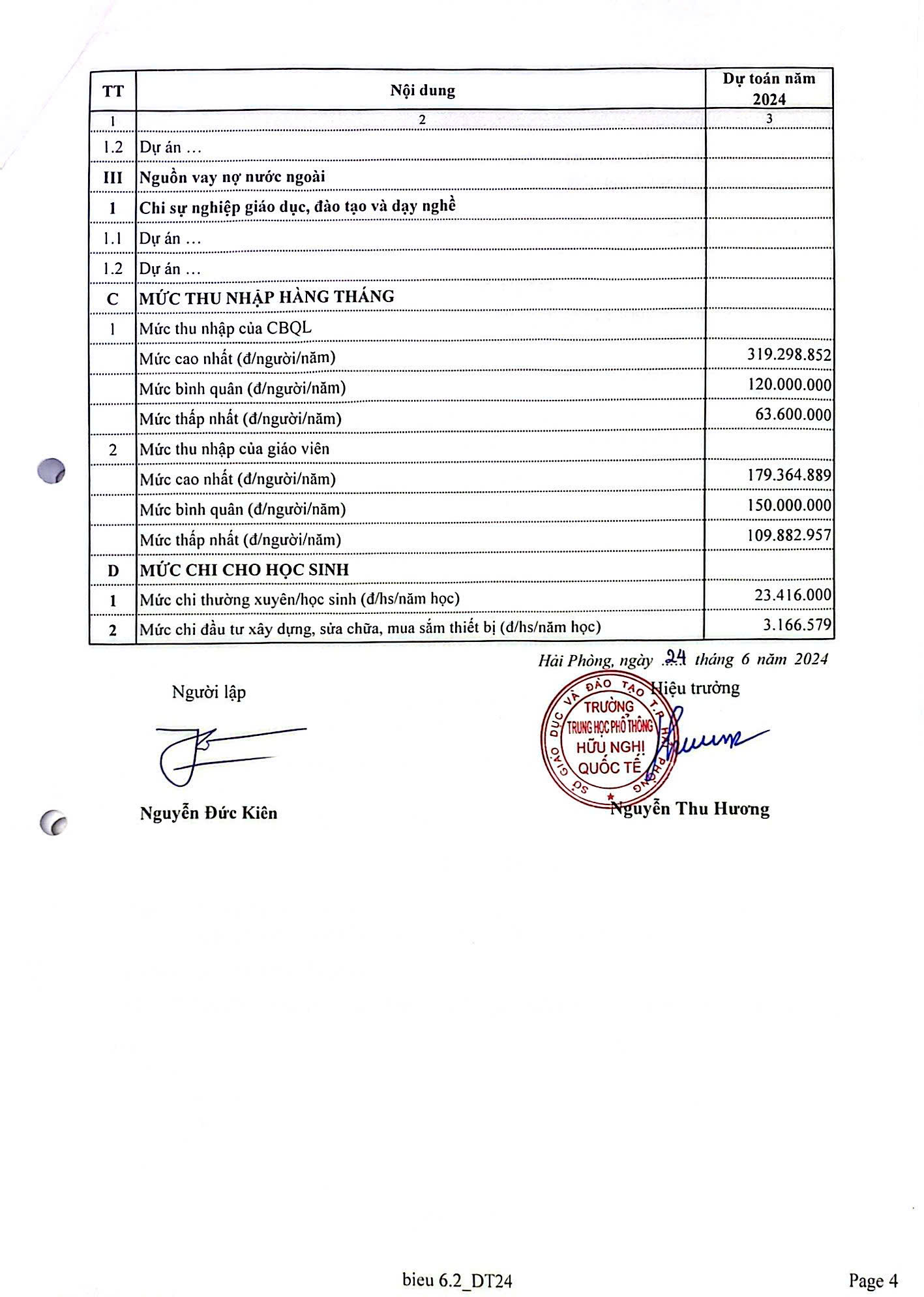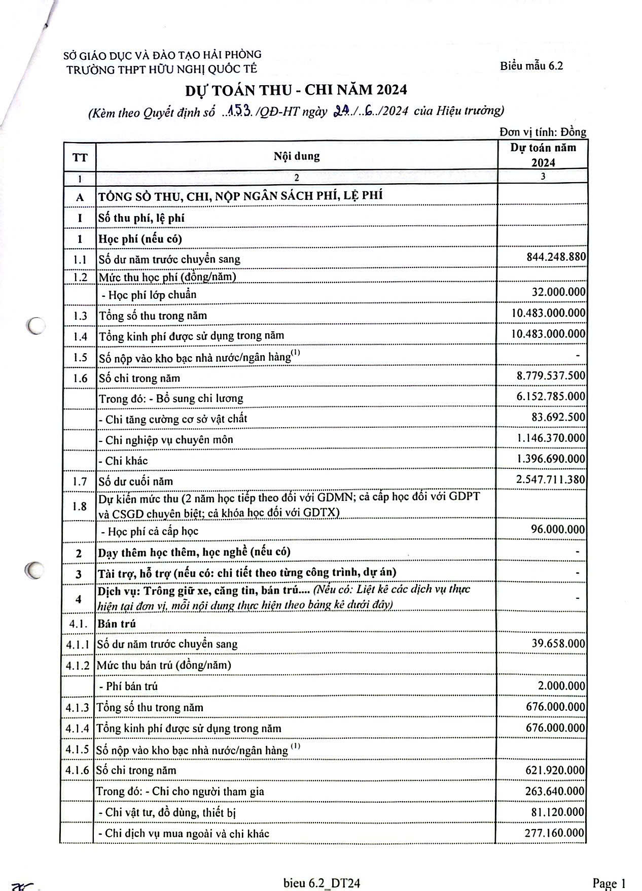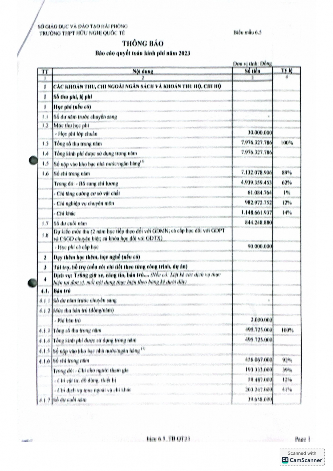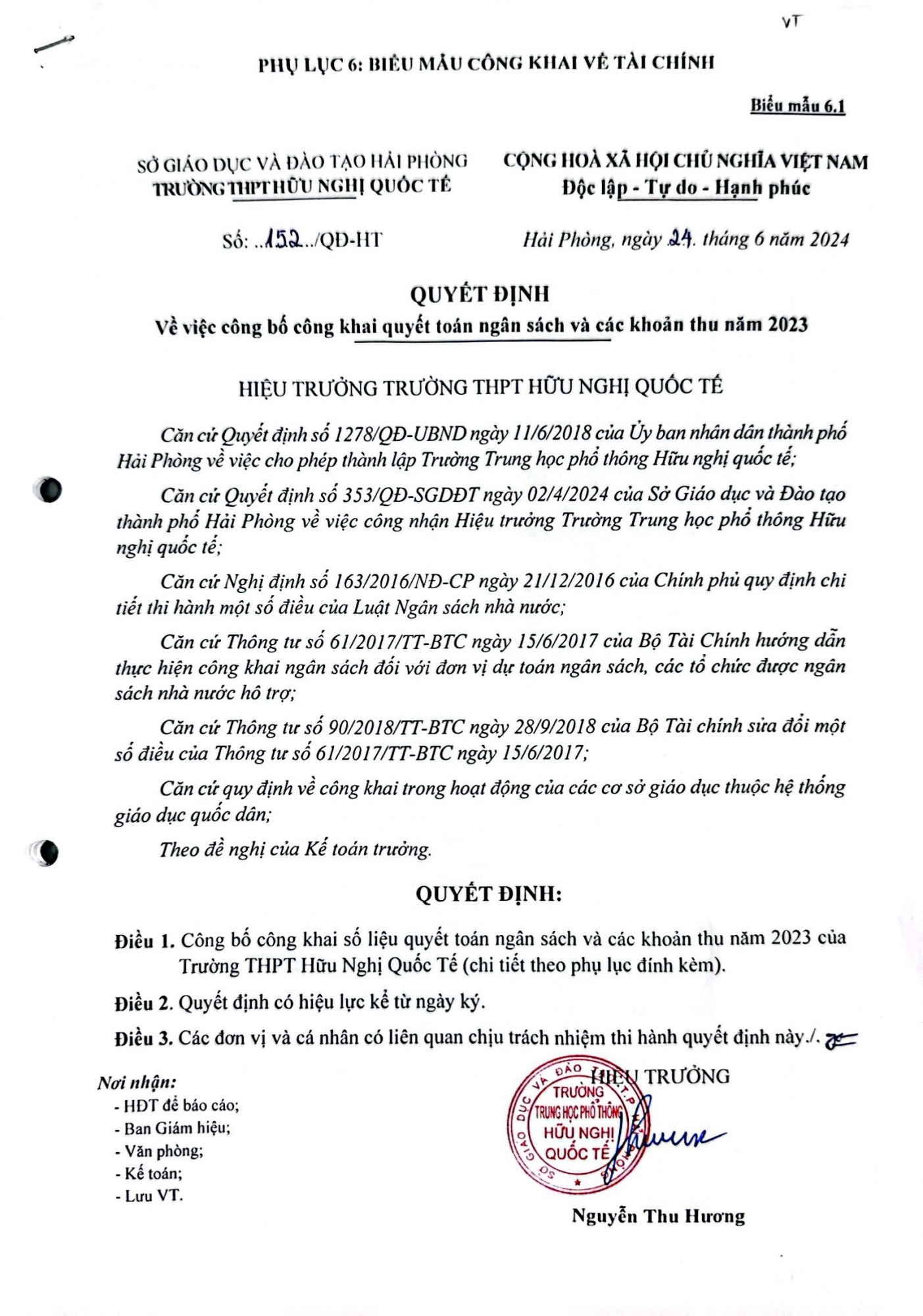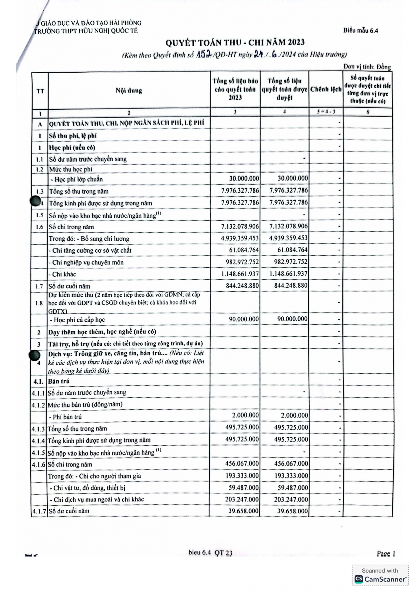 Báo cáo của trường THPT Hữu Nghị Quốc tế về việc công bố công khai quyết toán ngân sách và các khoản thu năm 2023; công bố công khai dự toán ngân sách và các khoản thu năm 2024