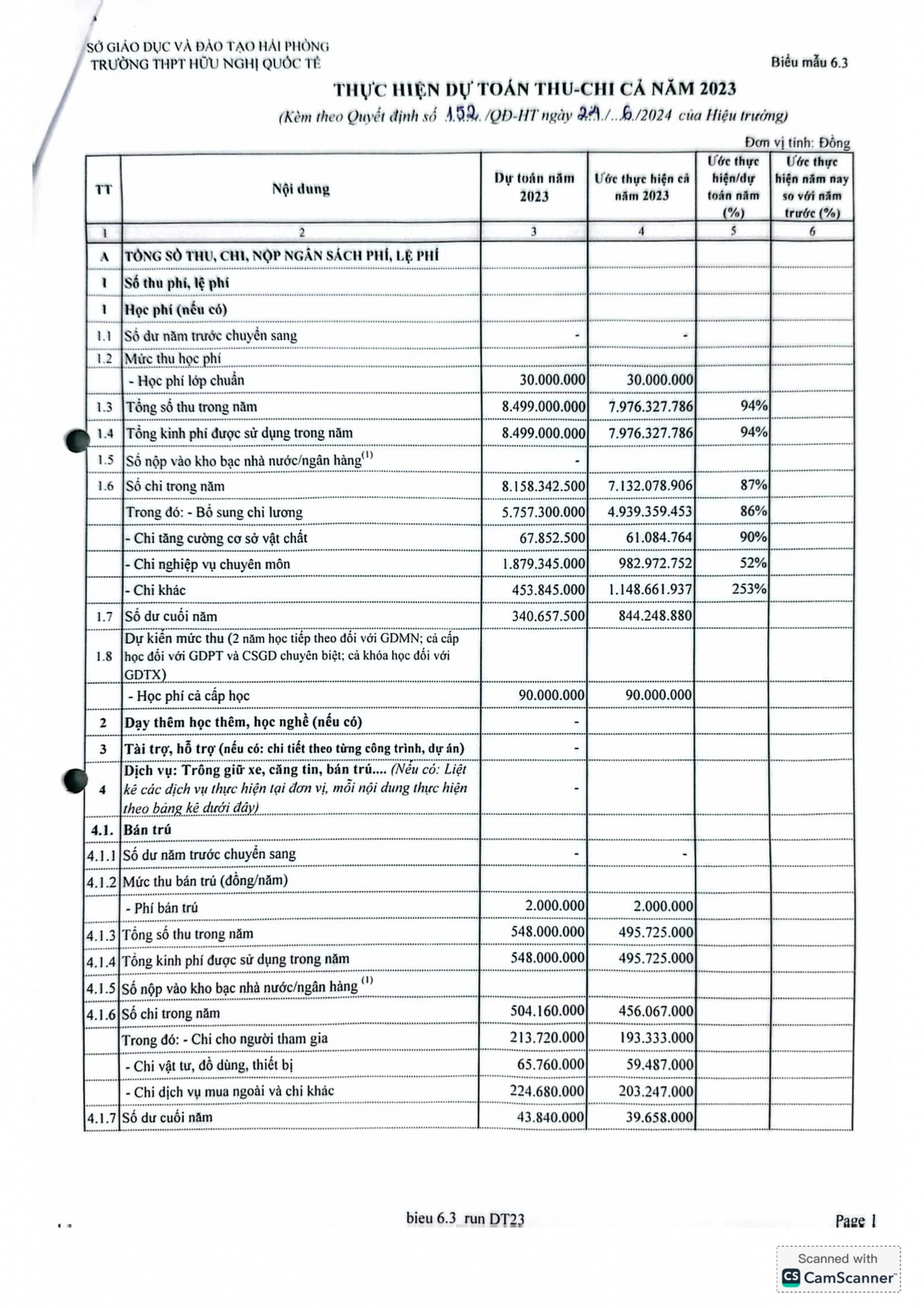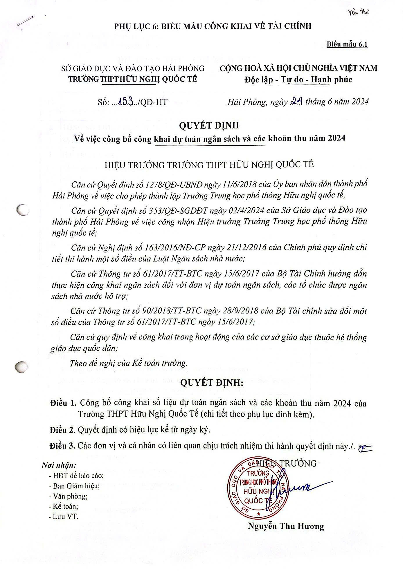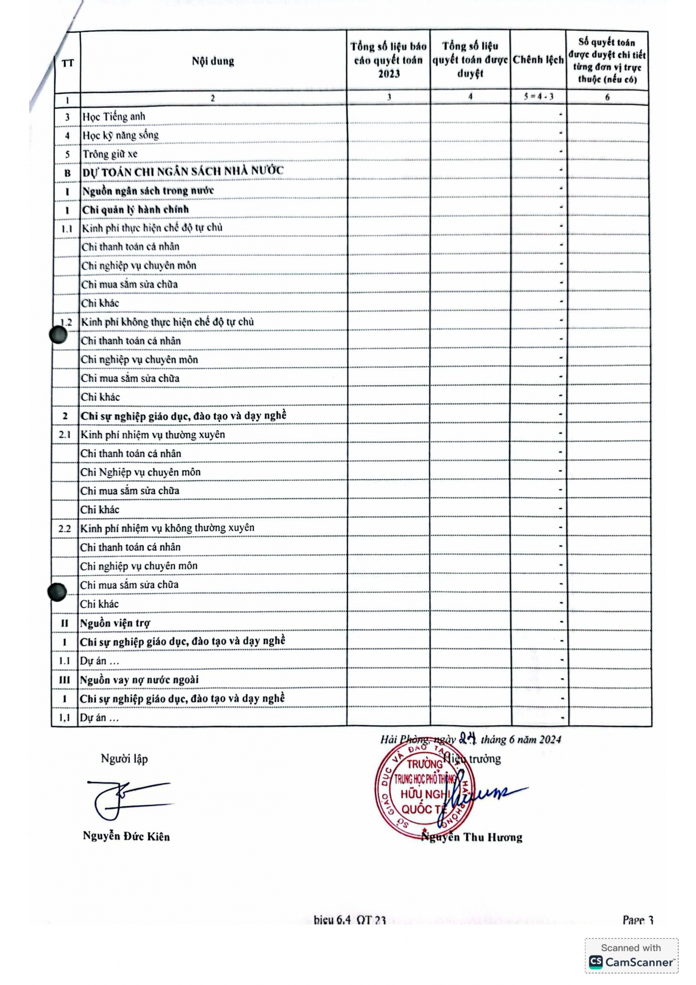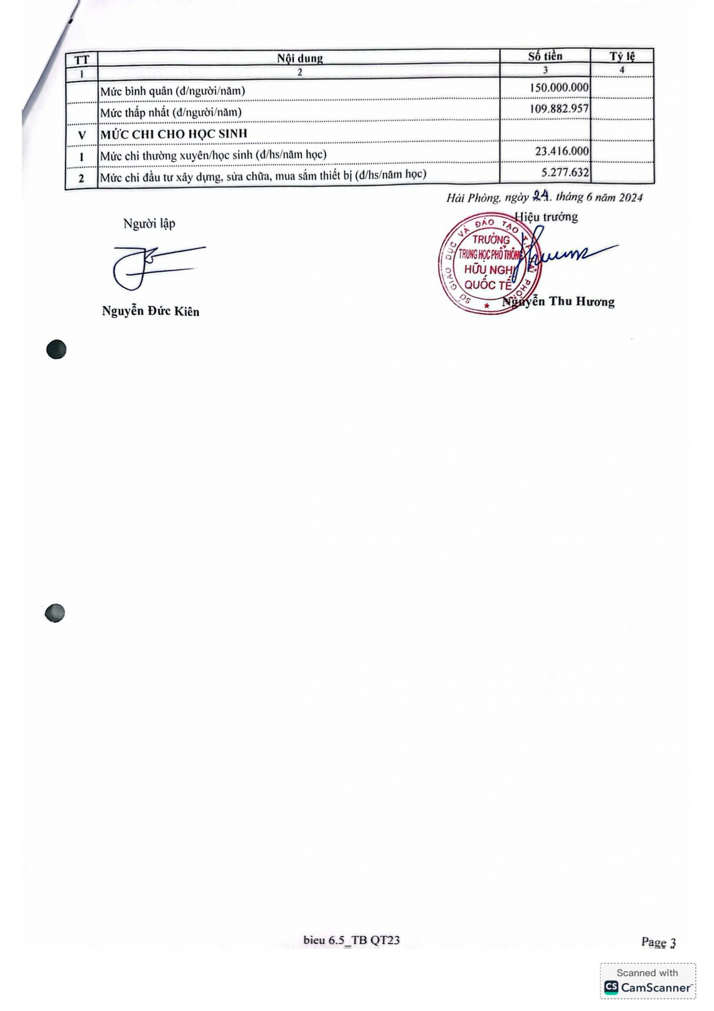Báo cáo của trường THPT Hữu Nghị Quốc tế về việc công bố công khai quyết toán ngân sách và các khoản thu năm 2023; công bố công khai dự toán ngân sách và các khoản thu năm 2024