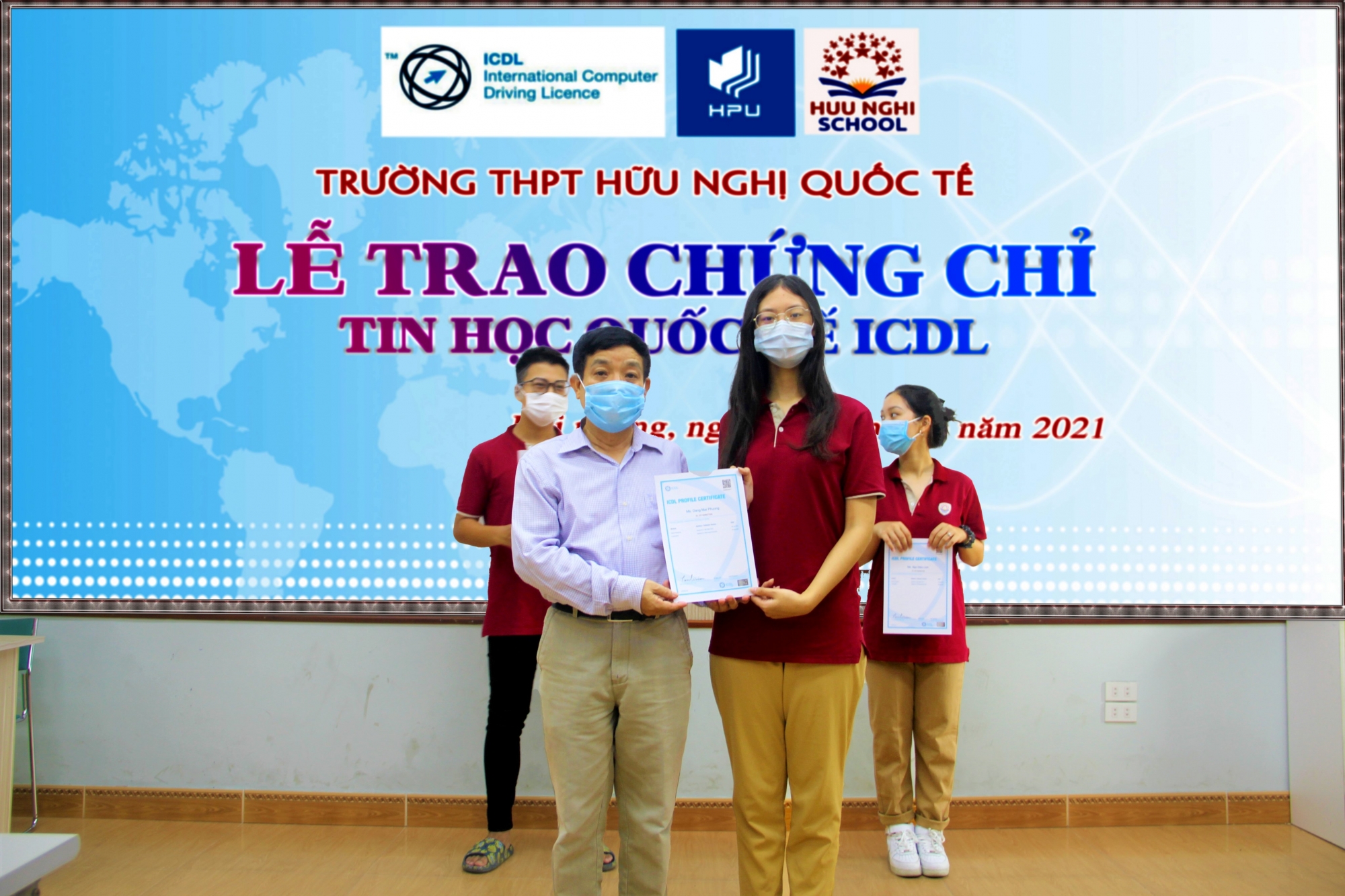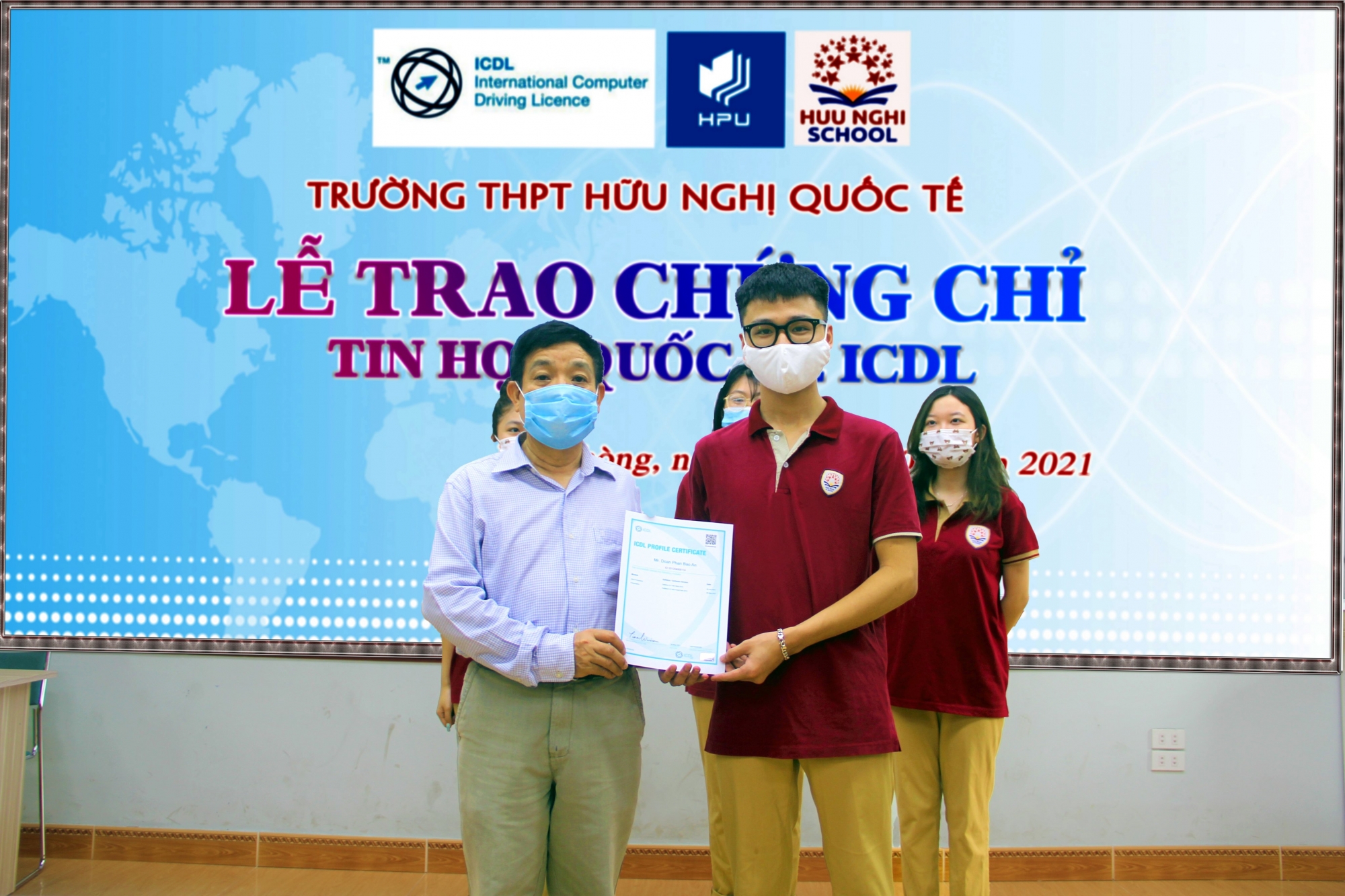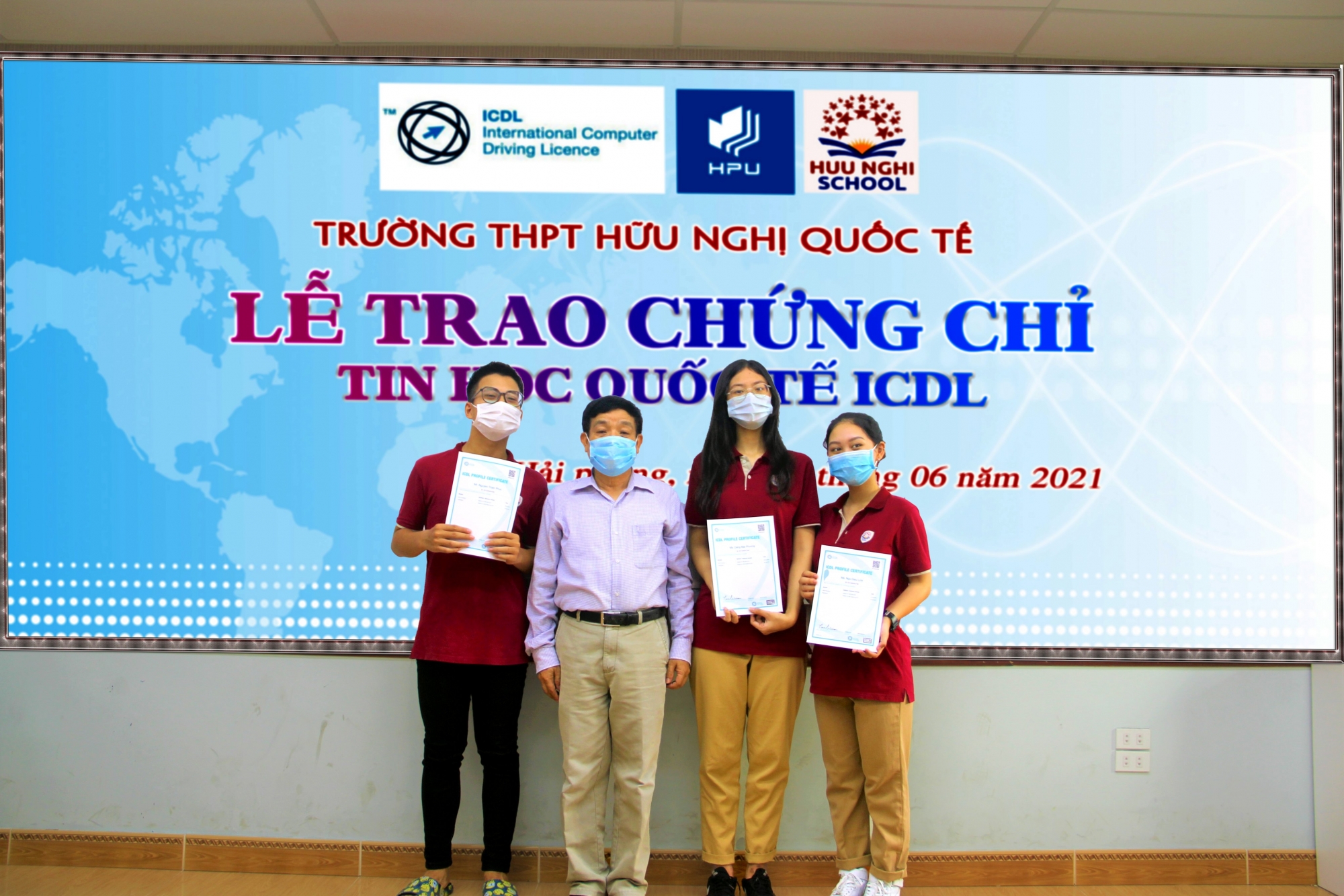 Sáng ngày 2/6/2021 Trường THPT Hữu Nghị Quốc Tế đã tổ chức lễ trao chứng chỉ tin học quốc tế ICDL cho đại diện 8 học sinh khối 11 Trường THPT Hữu Nghị quốc tế đạt thành tích cao trong kỳ thi ICDL do Trung tâm khảo thí ICDL trường Đại học Quản lý và Công nghệ Hải Phòng tổ chức.
