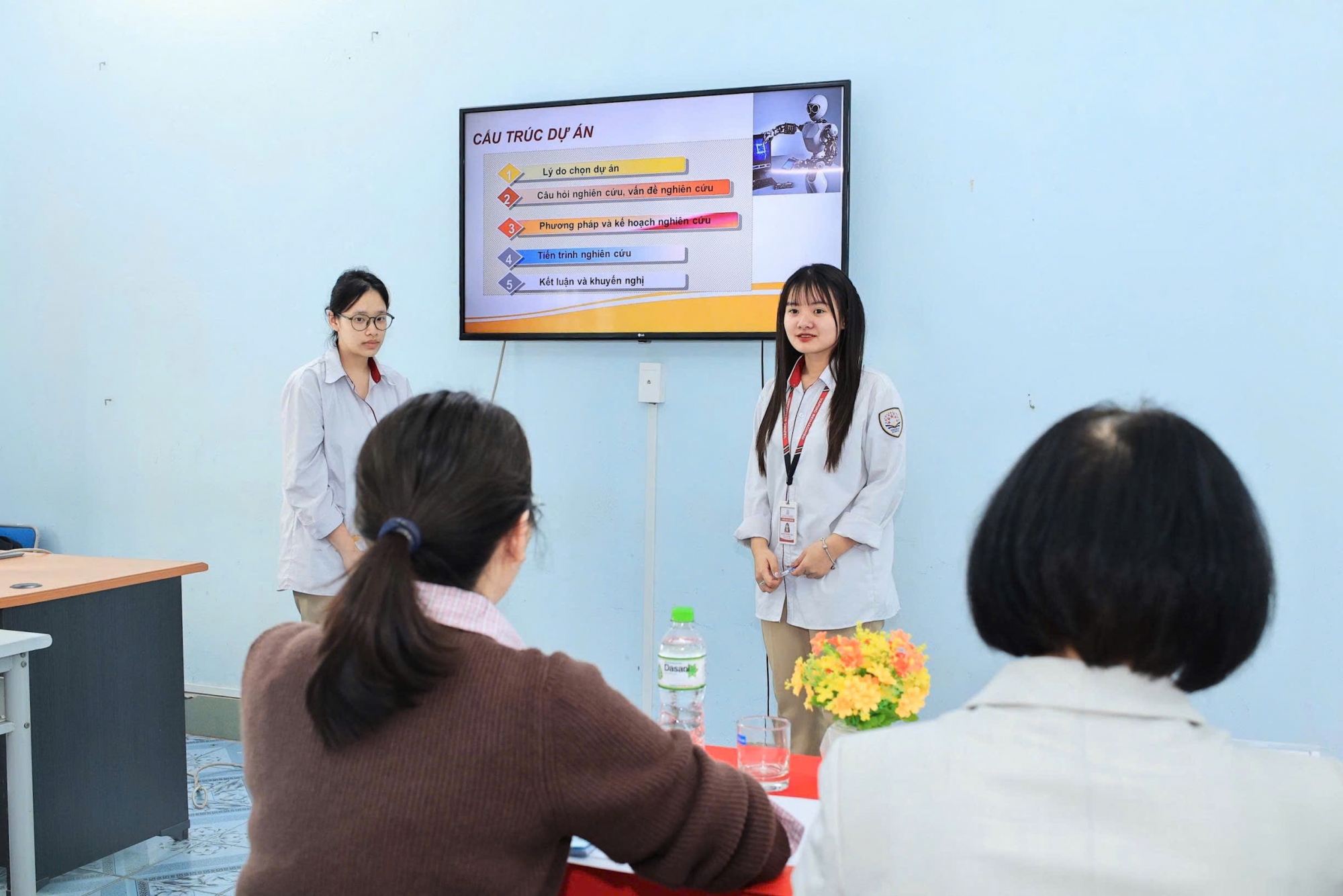 Buổi trình bày dự án nghiên cứu khoa học kỹ thuật cấp trường đã diễn ra trong không khí nghiêm túc, học thuật với sự tham gia của Ban Giám hiệu cùng thầy cô giáo trong nhà trường. Tại đây, nhóm nghiên cứu dưới sự hướng dẫn của thầy Bùi Kim Cương đã trình bày rõ mục tiêu, phương pháp nghiên cứu, kết quả đạt được cũng như những đề xuất giải pháp liên quan đến việc sử dụng AI trong học tập của học sinh THPT.