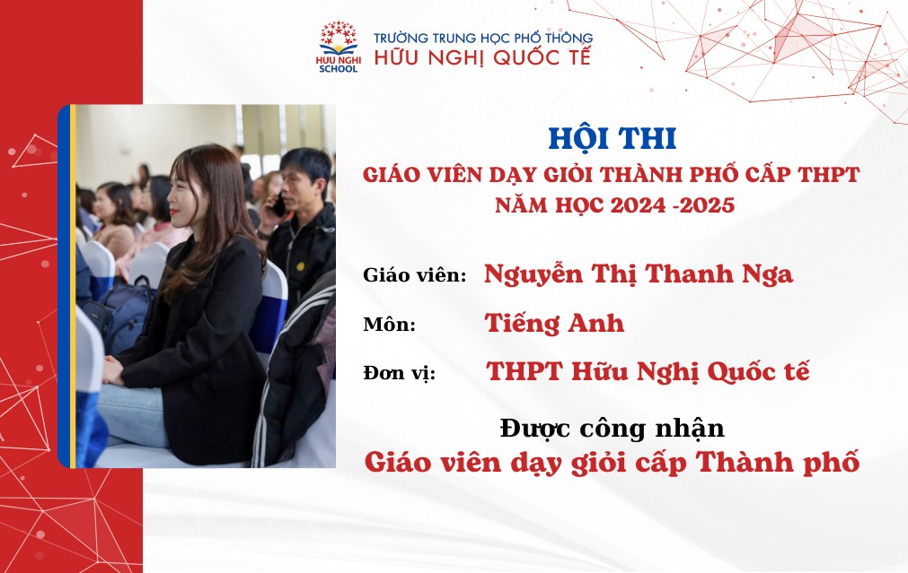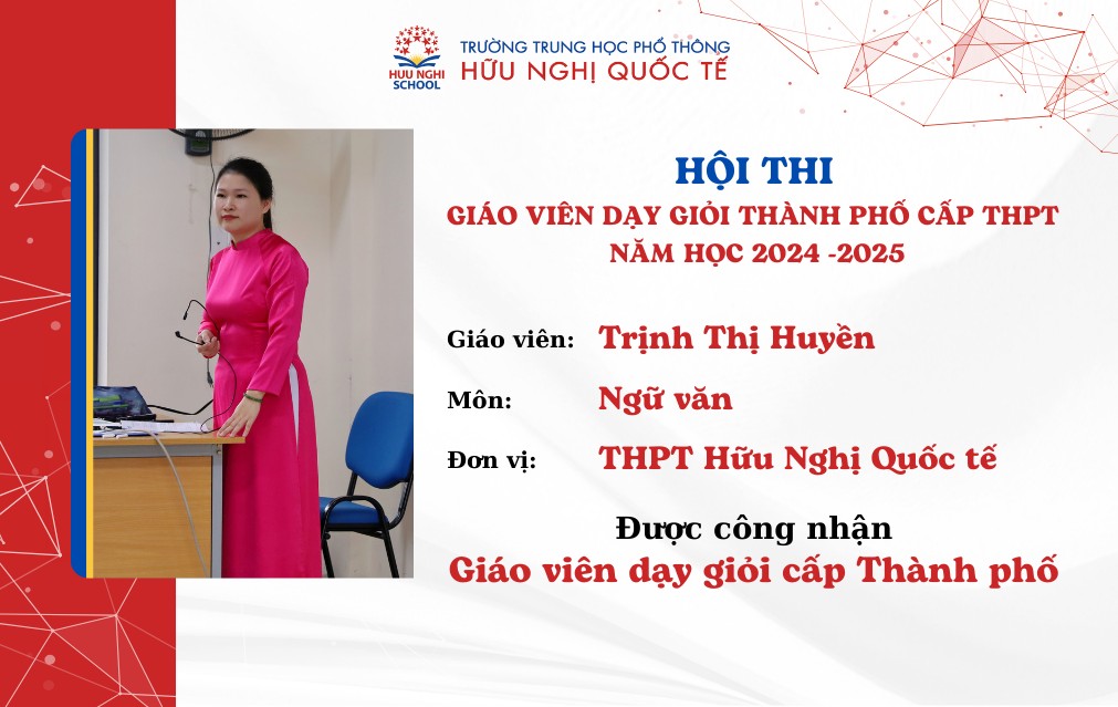 Trong hai ngày 19 và 20 tháng 2 năm 2025, Trường THPT Hữu Nghị Quốc tế đã vinh dự tham gia Hội thi Giáo viên dạy giỏi cấp Thành phố, một sự kiện quan trọng nhằm tôn vinh những nhà giáo xuất sắc, có chuyên môn vững vàng và luôn tận tâm với sự nghiệp giáo dục. Hội thi không chỉ là sân chơi để các thầy cô giáo thể hiện tài năng giảng dạy mà còn là dấu ấn đáng nhớ trong hành trình sự nghiệp của mỗi nhà giáo.