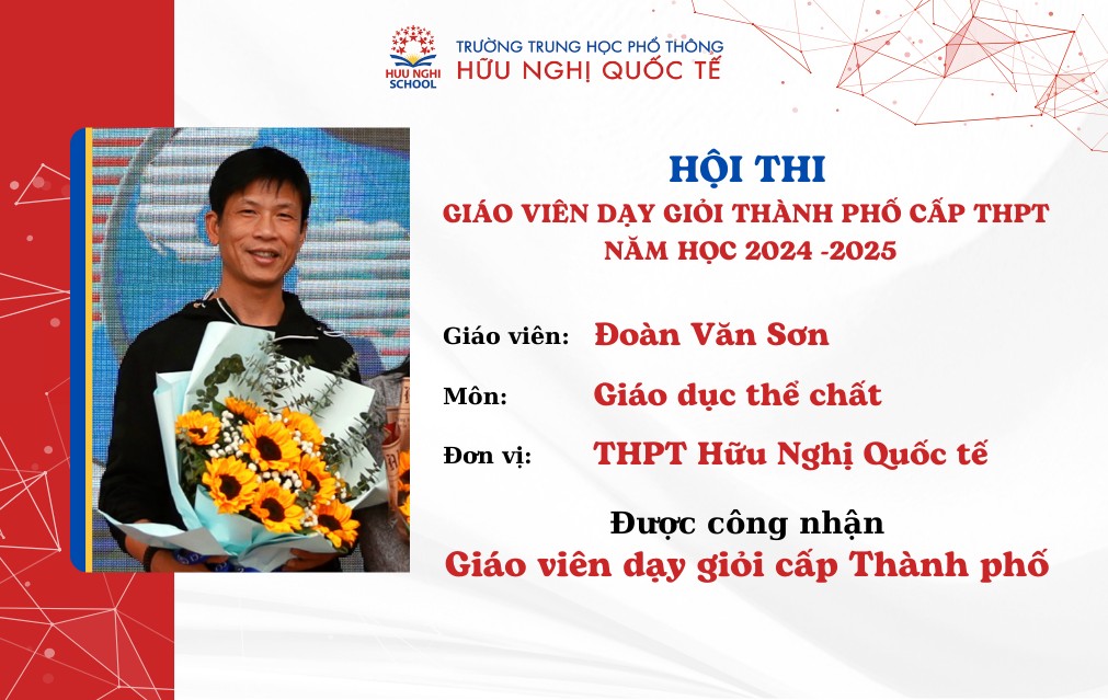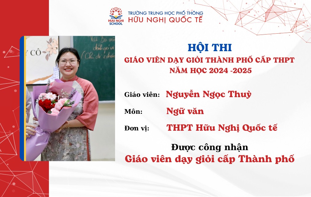 Đặc biệt, Trường THPT Hữu Nghị Quốc tế vô cùng tự hào khi có 04 thầy cô giáo xuất sắc đạt danh hiệu "Giáo viên dạy giỏi cấp Thành phố". Đây không chỉ là thành quả của cá nhân mỗi giáo viên mà còn là niềm vui chung của toàn thể nhà trường. Thành tích này thể hiện tinh thần trách nhiệm, sự tận tâm và sự cống hiến không ngừng nghỉ của các thầy cô trong công tác giảng dạy, góp phần nâng cao chất lượng giáo dục của nhà trường nói riêng và của thành phố nói chung.